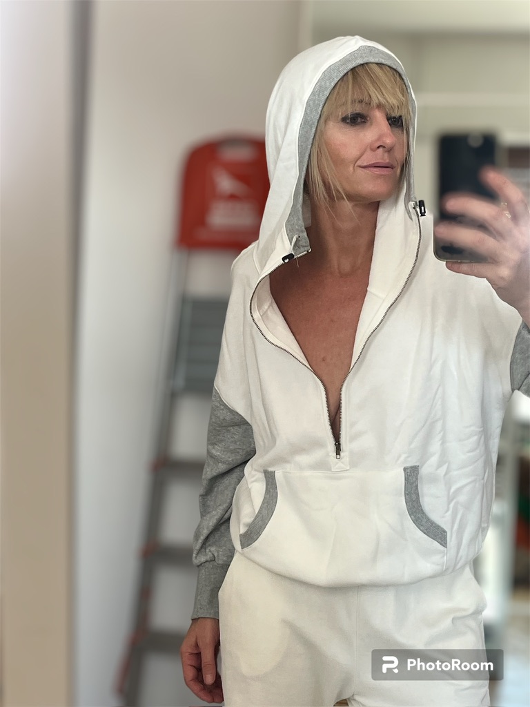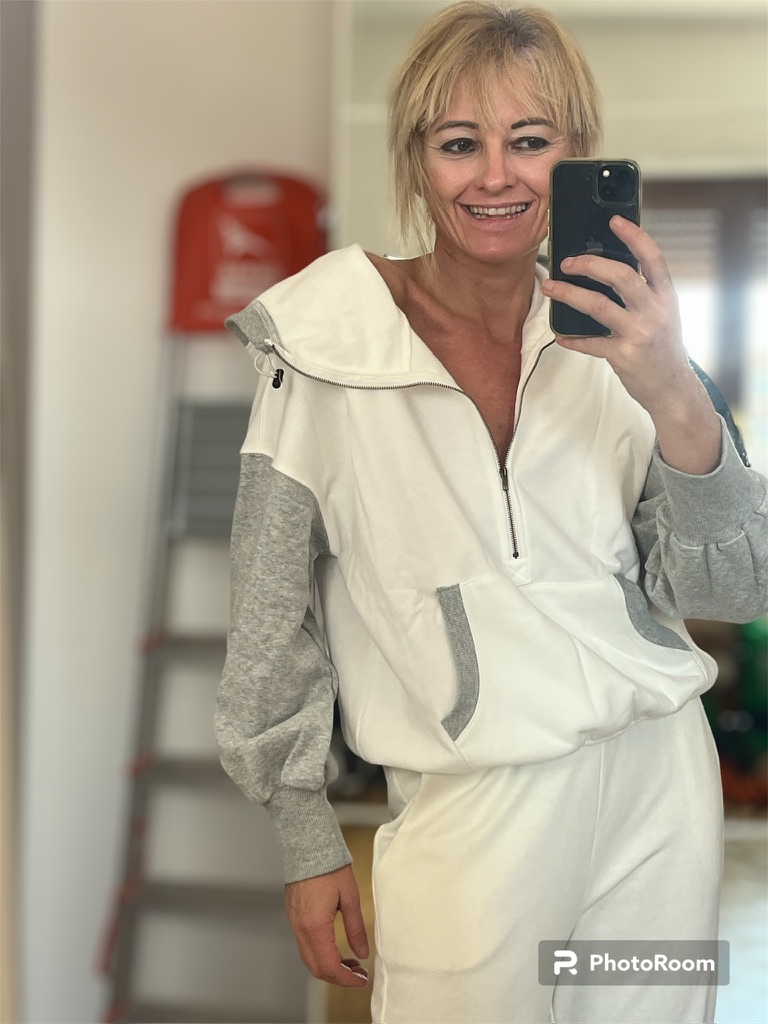 Nelle foto la trovate abbinata al pantalone jogger che trovate sia in grigio sia in bianco panna.
